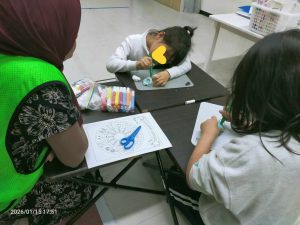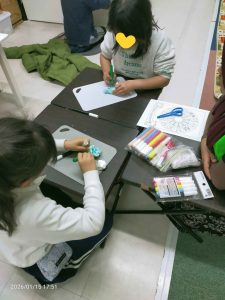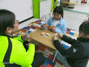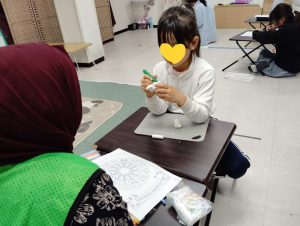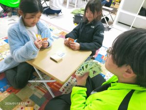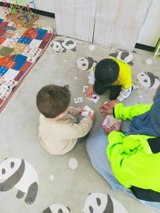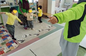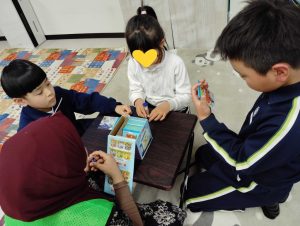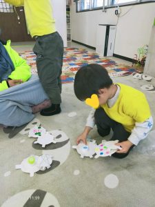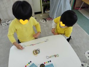 ランチタイムの後は、カメの子タワーゲームをしたり、輪ゴムを繋いでゴム飛び遊びのゴム紐を作ったり。