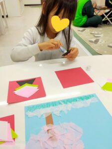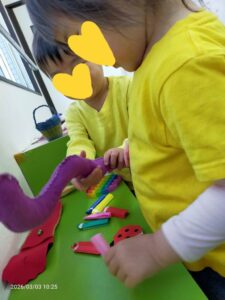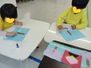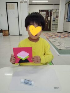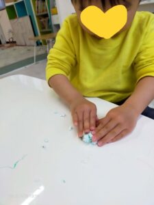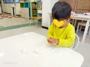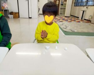 あいにくの雨で公園へ遊びに行けませんでしたが、代わりに紙ねんどでひし餅を作りました。