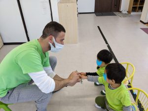 外国人たちとカードゲームを楽しんだ子もいました。おやつを食べて、Jingle Bellsを練習。その後はMr. Chasと公園遊びに連れて行ってもらうグループと、屋内でペイントを楽しむグループに分かれました。私は体験説明会のご予約があったので、あまり写真を撮れませんでしたが、体験のお子さまにもお母さまにも楽しそうな様子を見て頂きました。