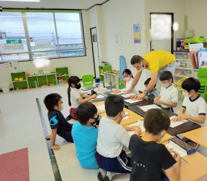 おやつを食べて、Mr. Chasのアクティビティ準備に、子どもたちが興味深々。