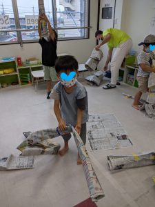 高さを競おうとすると、新聞紙の強度が足らず、倒れてしまいます。なかなか立たせることができず、皆苦戦しました。そういうことが大事ですよね。