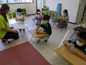 アクティビティは、ヤクルトのプラボトルでボート作り。そして、もう一つ、選択できるライティングアクティビティを準備しました。説明をした後で、選んでもらったら、半数近くの子どもたちがライティングを選んでくれて、びっくり^^意外と、興味を持ってくれていたのだと思うと嬉しかったです。