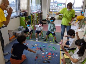 魚作りに協力してくれたら、ゲームの回数が増やせるチケットがもらえるシステムにしたら、子どもたちが張り切って魚を作ってくれました。あっという間に大漁!釣り竿は、5年生と3年生の男の子2人がしっかり作ってくれました。