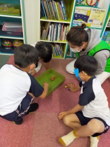Miss SarahとMiss Gloriaがあやとりで子どもたちと遊びました。