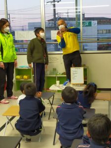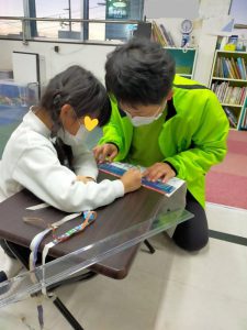 新聞紙と爪楊枝で作ったコマ、驚くほどよく回るんです。新聞紙の幅や取り付ける位置などがポイントみたいでした。また、新聞紙を、破れない程度に引っ張りながら巻くというのも、かなり大事なポイントで、1年生たちは苦戦していました。こういう小さな力加減、指先を使うのは良いですよ^^高学年の子たちには、ビッグサイズのものを作ってみては?と提案したところ、早速取り掛かっていました。完成が楽しみですね。