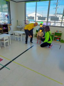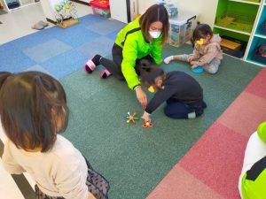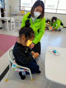 クラフトタイムでは、雪ウサギのバランスおもちゃを作りました。本当にシンプルなのに、どうしてでしょうか?全部表情が違って見えます。普段、折り紙などで直線を合わせることは多いのですが、半円で縁を合わせるのは、子どもたちも少し戸惑い気味でした。それでも最後にはきれいな雪ウサギを完成できました。
