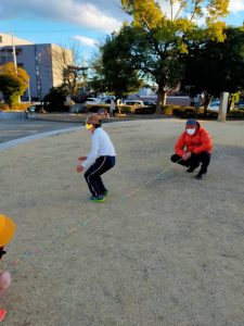 おやつを食べたら公園へ遊びに出かけました。公園では、輪ゴムを繋いだゴム飛びをしてみんなで楽しく遊びました。