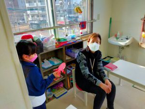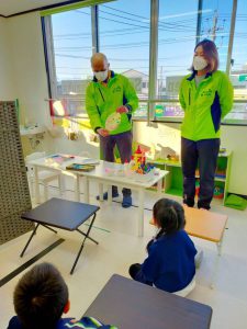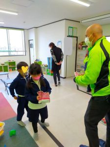 おやつの時間に、スクールから愛のバレンタインチョコレートのプレゼントを渡しました。みんな中身が気になっていた様子。家に帰ってから楽しんでくれたかな。