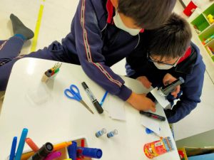 スクールに戻ったら、バレンタインクラフトを楽しみました。紙皿をホールケーキに見立てたデコレーションアート。
