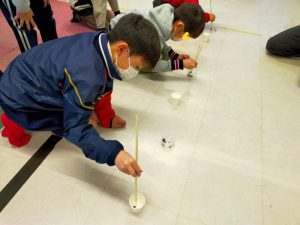 今日のアクティビティは、豆つかみ。長い箸で、小豆と金時豆を運ぶゲームです。こういうのはやっぱり盛り上がりますよね。
