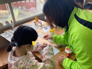 サークルタイムの後のクラフトタイム。年下の子たちは、プラスチックテープでさかなつりゲームを作りました。テープをねじる、大人には何でもないことでも、これくらいの年齢の子どもたちにはそうではないことが多々あります。結構忍耐力が要ります。その分、完成したさかなつりゲームで遊べる喜びは大きかったようです^^