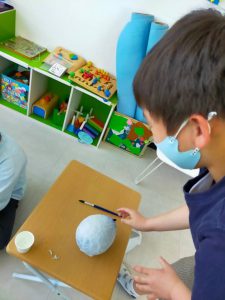 これは見本です。子どもたちの作品は、数日乾かします。乾かしたら、色付けなどをします。サンプル品は、まるで電球のようですが、子どもたちのものは、比較的卵らしい形になるのでは、と期待しています。長期休暇はこういう少し時間がかかるものに取り組めるのが良いですね。