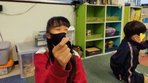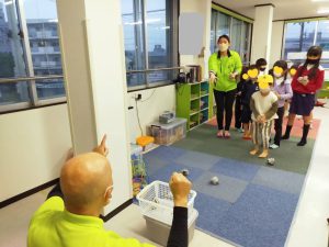 お昼ごはんを済ませたら、いつもはパークタイムですが、今日はあいにくの雨。そんなわけで、屋内で新聞紙を使った遊びをひとつ。ボールを丸めることから自分たちで始めて、最後は玉入れ。シャイだった体験のお子さまも、あまりにも楽しそうな様子に、ボール作りから参加してくれました。Sちゃんも、同じく。何度か”Would you like to join us?”と誘っても、Sちゃんは”No.”という返事でしたが、やっぱり楽しそうだったのでしょう。大急ぎで自分のボールを作って列に並んで、楽しんでくれました。