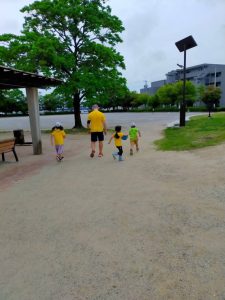 先週は弁天山公園の大イベントにより、早々に切り上げたパークタイムでしたが、今日はしっかり遊べましたね。Mr. Davidとのボール遊びに子どもたちがたくさん集まりました。ブランコではMiss Charleneが付き添い、MくんとJくんは、気が付けば水の中でした(笑)。連れて行って、安全を見守るのはかなり大変と言えばそうなのですが、こうやって子どもたちが思い思いにのびのびと遊ぶ姿を見ることができるのは、良いものです。水遊びだって、着替えとサンダルがあれば大丈夫。