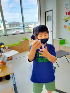 午後からのアクティビティは、簡単スライム作り。Perry不在のため、久しぶりに最初から最後まで私が(もちろん全て英語で)担当させていただきました。私だと、子どもたちもいつもより緊張感があったような・・・(;^ω^)