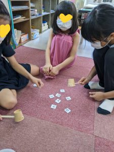 そしてアルファベットカードかるたも遊んでみました。3色の小さな玉の色分けをする遊びで、スクールではKくんが今日初めて達成しました。とっても根気が必要な遊びです。完了をしった年下の子たちは尊敬のまなざしでKくんのそばに集まって来ました。かっこいいお兄ちゃんが居てくれるのは、良いですね。