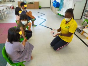 最初の説明を終えて、昨日来ていなかった子たちのところに実物をもって回っていたMiss Perry、あろうことか手が滑り、易田が子どもあt地の足元にばしゃりっ(;^ω^) 間一髪、最悪の状況は免れましたが、Aくんのソックスが犠牲に・・・ごめんね、Aくん。でも大丈夫、こういうこともあります。気を取り直して早速スーパーボールを作り始めました。