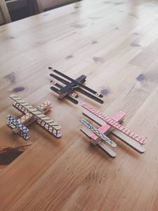 クラフトアクティビティでは、木製洗濯ばさみとアイスの棒で飛行機を作りました。