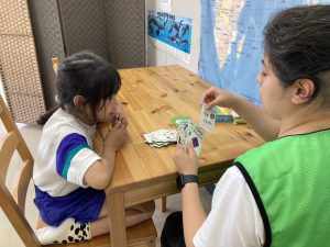 2023年5月29日 / 最終更新日時 : 2023年5月29日 nakajima 津英語学童 5月29日(月) 皆で週末についての絵日記を描いてもらい、英語の練習をしました。 英語UNOで発話の練習 トランプでピラミッドを作ってみたり サークルタイム 今日から梅雨入りしたそうです。しばらくは不安定なお天気が続きますが、スクールの中で子どもたちと一緒に楽しい時間を過ごそうと思います。