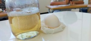 午後のサイエンスアクティビティは、酢に浸けた卵の観察2日目。昨日、酢の中に生卵を浸けました。昨日はまだ卵の周りに小さな気泡ができていた以外、特に何の変化も見られませんでしたが、さて今日は?
