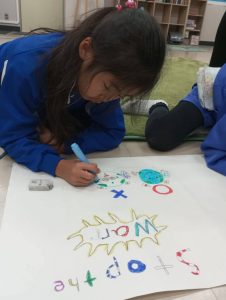 2023年12月4日 / 最終更新日時 : 2023年12月4日 nakajima 津英語学童 12月4日(月) 寒い日でした。また新しい1週間の始まりです。英語UNOで発話の練習。 今日のアクティビティは、平和の祈りプロジェクト。 近くクリスマス🎄が来ます。世界に平和を・・・。全ての子どもに笑顔を・・・。 残り時間はボードゲームをしたりプッシュポップで遊んだり。