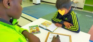今日はみんな早帰りの月曜日でした。明日の卒業式の準備があるためですね。宿題もいつもより少なくて、早くにライティングやリーディングの練習ができました。Rくんのリーディング練習を見ていて、本当によく読めるようになっているのがわかりました。継続の成果がくっきり表れています。これなら色々なカードゲームも、楽しく遊べていると思われます。更なる上達が楽しみですね。以前、Kくんのお母さまからも、お家でずいぶん長い絵本が読めるようになっていて驚いたというお話も聞かせて頂いたりして、子どもたちのリーディングやライティングの力が上がっていることは間違いなさそうです^^この調子て、力をつけて、進級したらもっと色々なアクティビティに参加してもらいたいです☆