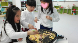 ハムを切って、卵に塩とMilkを入れて、ホットプレートでCooking。こんな感じで、楽しく調理が出来たみたいです。