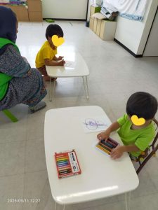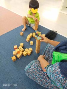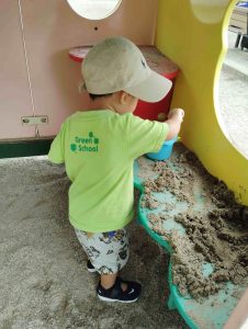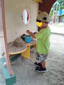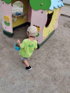 お昼ごはんを食べても、Eくんの学びの時間は終わらず。続きを思いゆくまで楽しんでもらえるよう、Eくんは屋内で自由学習。Mくんは私と一緒に公園へ~。