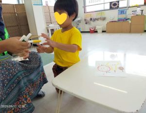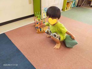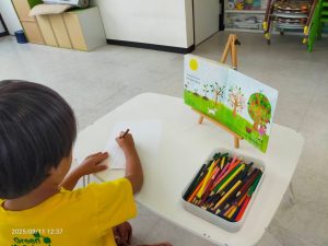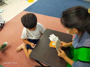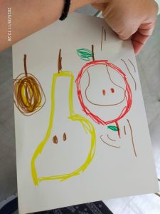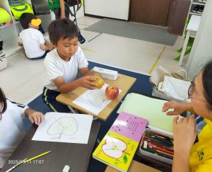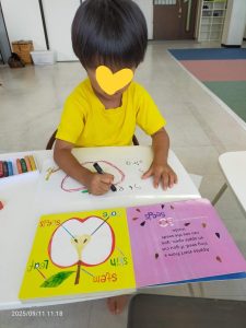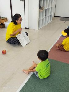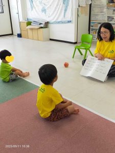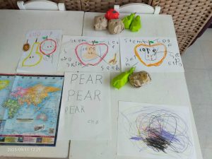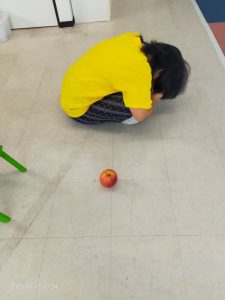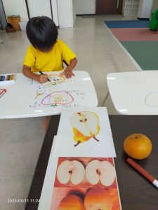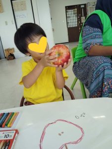 りんごのアクティビティからEくんはどんどん自分で色々なことを学んでいきました。りんご一つとっても、たくさんのことを学べます。りんごのことから色々な言葉を増やせて、楽しい時間になりました。そして、今日は更に梨のことも。