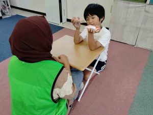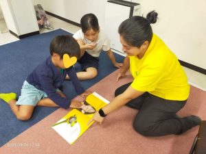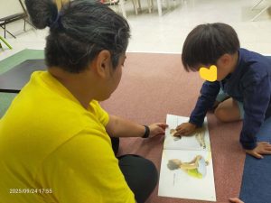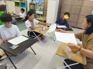 ふと、先週末に使ってもらった和梨が置き忘れてあったため、和梨の断面図アクティビティを開催~。冒頭では、出張のお土産を渡してリラックス。アクティビティに入って、このりんご、和梨の断面図では、実に面白かったです。リンゴや梨を自分で切ったことがある子どもは少ないですが、横に切った断面というのは想像もしたことがないのでしょう。先ずは縦の断面を絵本で紹介。すると、この印象が強くなり、横の断面の想像図は、縦のイメージから抜け出せなくなってしまっていました。それでも、芯や種の存在はそこにあることが想像できていたようです。この横の断面は、大人ですら想像は難しいと思います。リンゴや梨を横の真っ二つに切って食べる人はまずいないでしょう。身近な物でも、少し角度を変えて見ると、新しい発見や気づきがあるものです。今日はそんな楽しい時間を子どもたちと共有することができました。