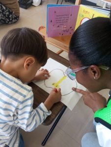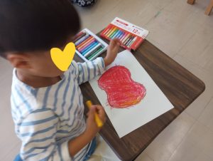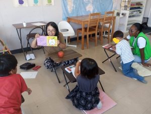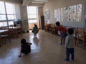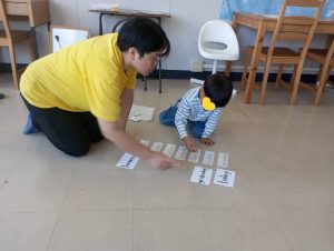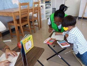 お迎えに来られたお父さまに、りんごが食べたいと言っていたYちゃん。見本のりんごがあまりにもおいしそうだったのか知れませんね。今日はりんごを買って帰ってお家でりんごのアクティビティのお話をしてくれそうです。二つに切った断面図、今日の絵本と同じだったか見れるといいな🍎
