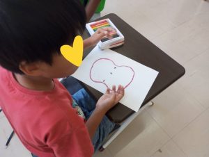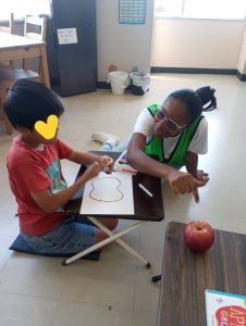 りんごを持ってきて、色々質問しました。そして、このりんごを2つに切ったら、中はどうなっているか、その断面図を描いてみてもらいました。