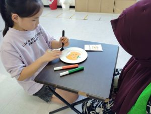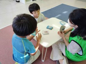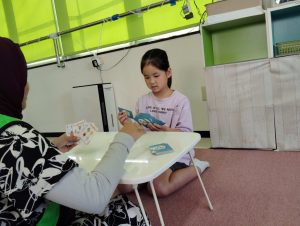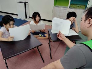 ストーリーテリングの練習をする年上の子たち。小さな発音だっておろそかにしませんよ。