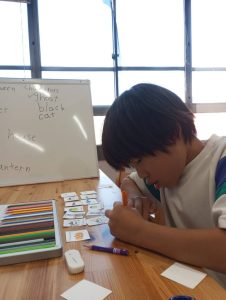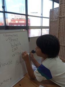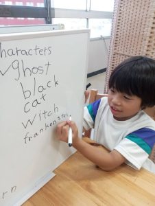 低学年は、🎃のキャラクターを使ったライティングでスペルの練習。