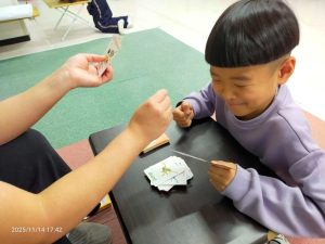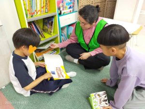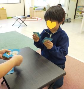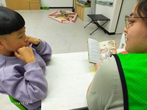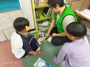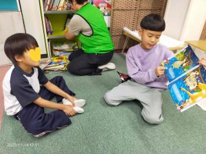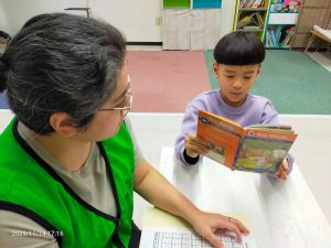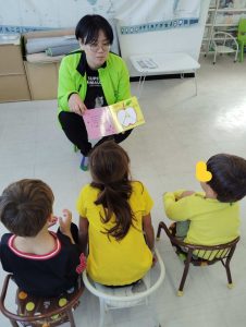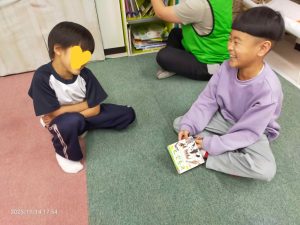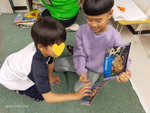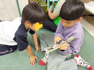 先生が読んでくれるのとは違って、身近なお友達が英語の読み聞かせをしてくれると、興味もひとしおでしょう。1年生のAくんが、来年は新1年生に良み聞かせをしてくれるのでしょうか。
