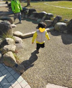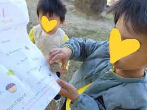 そしてパークタイム。準備した、秋探しを一緒に楽しみました。ドングリや居様々な色の落ち葉、木の皮や石だって、探してみるととても面白いのです。