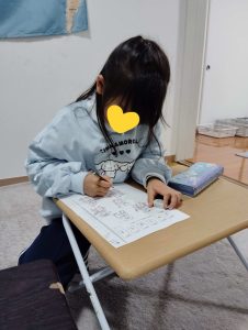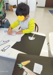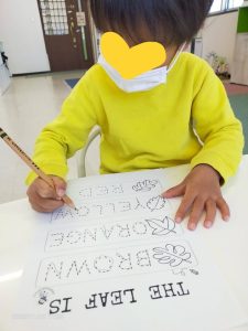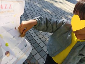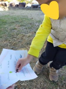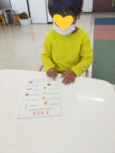 午後のパークタイムで、秋探しをするための下準備。これも文字をたくさん読めるようになってきたからこそ楽しめる遊び方です。