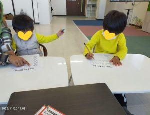 今日は初めての2人を連れての第2教室でのクラス。今日はフォニックスの基本の最初のところをみっちり。1時間を越えましたが、しっかり2人とも取り組んでくれました。