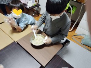 第2教室のアクティビティで作ったマッシュポテトとグレイビーソースを楽しみました。