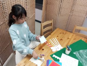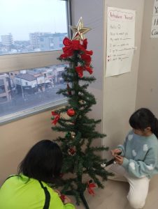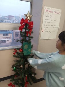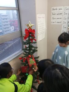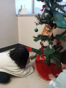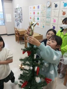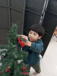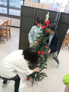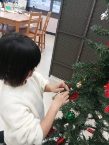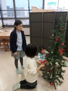 そしていつもの放課後の時間になると他の子どもたちがやって来て、今日は12月1日。はい、クリスマスツリーの飾りつけをしましたよ。
