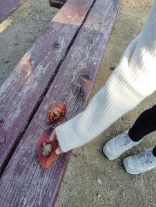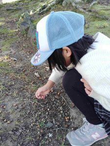 スクールに戻って、収穫を楽しみ、落ち葉や木の実をウエットティッシュで拭いていたら、、、松ぼっくりの中の種子を見つけました。