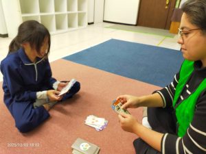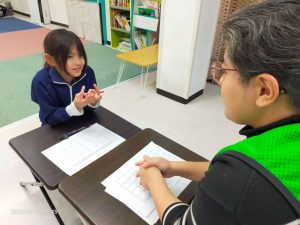 今月は今日が初日のSくんに、今月のカレンダーを作ってもらいました。う~ん、色々どういえばいいのかな~、と少し困っている様子だったSくん。そこに救世主のRくん登場。昨日第2教室でカレンダー作りを既に経験済みのRくん。行事の名前を英語にするのもしっかり覚えていて、タイミングよく助け舟を出してくれたり、私の代わりにSくんに教えてくれたのでした。英語で表現できることはもちろん大事ですが、もとになる母国語でその知識を持つことの方が先に必要なので、こういう学習の時はRくんのような年上の子がいることで、その知識をシェアできるというメリットは大きいですね^^そして、教えることは自分の知識を確認したり深めたりすることができるので、Rくんの受け取るものもとても良いものだったことでしょう。