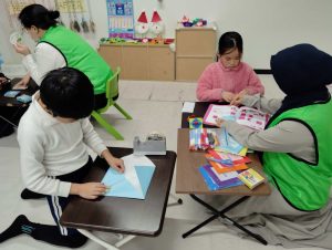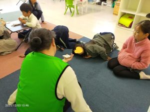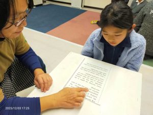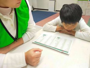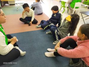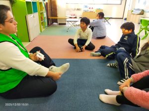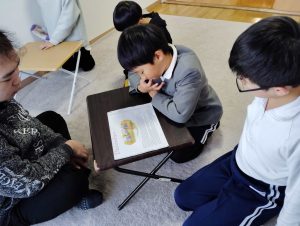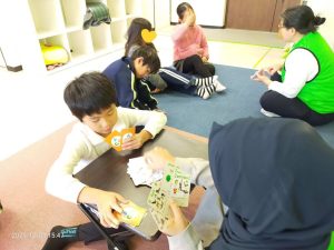夏に行った海外で手に入れていた、一本足を失ったロバのお話を読み聞かせしてもらいました。足を失った、と聞くと悲しいお話なのかと思えば、可愛らしいロバの豊かな表情でユーモアたっぷりに描かれていて、テンポも良かったため、子どもたちは楽しそうに参加してくれました。耳の不自由な人、目の不自由な人、言葉を発するのが難しい人などをdisabledという言葉で表す話もしました。