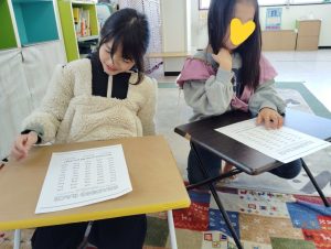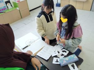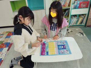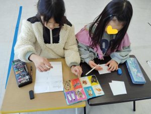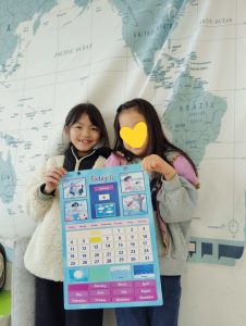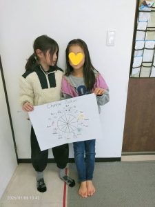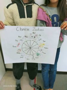 お昼ごはんの後に、話の流れで干支のことが話題になりました。そこから干支の図を作ることに。2人で協力して、絵担当と英単語担当に。期待以上の出来に私も大満足。お正月にぴったりなアクティビティでしたね。