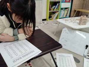 単語のリーディングレースを楽しみました。レースのたびごとにタイムが縮んで、子どもたち自身もびっくり。時間を計って、上達の実感を得られる練習は時に効果的です。